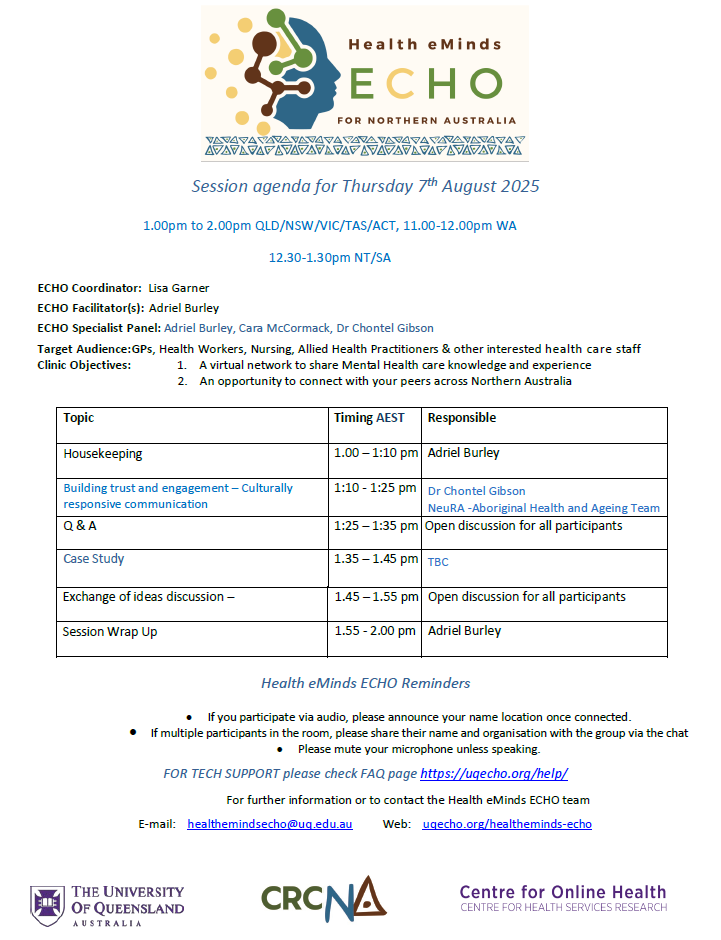 Health eMinds provides mental health education, peer connections and support for healthcare workers across Northern Australia. Building a collaborative and interactive online network, sharing knowledge and empowering participating health professionals to manage and support the delivery of mental health services in their communities, increasing capacity in the local health workforce through the sharing of specialist knowledge and peer experience.