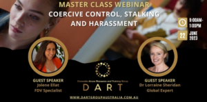The Coercive Control, Stalking and Harassment Masterclass will give you a deeper insight into the insidious presentations of FDV, Coercive Control, and Stalking and Harassment, and how these problems can co-occur. The Masterclass will also explore the impacts on victims and survivors and service system responses. We will provide you with relevant risk screening questions that assess for coercive controlphysical harm, imminent risk and valuable methods to help identify cases of stalking and harassment